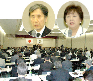 冒頭の挨拶では,全会一致で可決した歯科口腔保健法について,過去から現在まで各都道府県・郡市区歯科医師会の会員が地域住民に対する健康保健活動を続けてきたが,これらの活動がなければ,「この法律(案)を提出することも,可決されることもなかった」と述べた大久保満男会長(円内左).円内右は来賓として挨拶した石井みどり参議院議員.