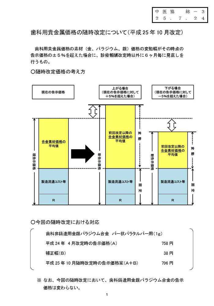 平成25年10月からの「歯科用貴金属価格の随時改定」について