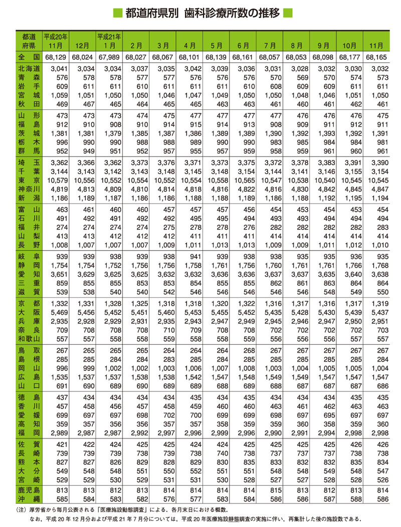 厚生労働省から毎月公表されている「医療施設動態調査」によると,平成21年11月末における歯科診療所数は全国で68,165施設で,前月(平成21年10月)比で12施設の減少であったが,前年同期比では36施設の増加となっている.