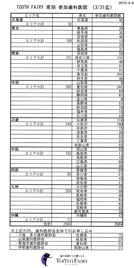 昨年6月に開始されたTooth Fairyプロジェクトの実績については先の日歯会見でも寄付金額(約4,092万円)や使途が発表されたが,この日は3月31日現在の県別参加歯科医院数(計2,584医院)の資料が配付された(表).さらに詳細な全国の参加歯科医院リストなど,各事業に関する情報は同財団HPで詳しく紹介されている.