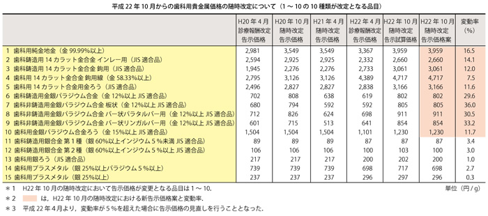 歯科用貴金属の告示価格は,市場価格の変動に対応して見直すことになっているが,本年4月からは,告示価格の±5%以上の変動があったものについて4月および10月に改定する,ということになっている(従来は±10%以上の変動があったものについて見直していたが,本年4月の診療報酬改定時に5%幅となった).